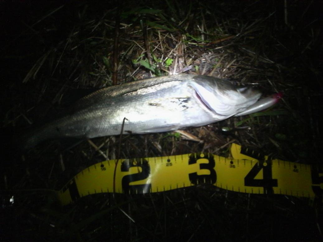 シーズン終盤の大潮周り、平日でありながら毎日釣行しています。 多摩川~横浜運河区間でウロウロ~っとね! んでは昨夜の釣課報告! 19:30~21:00・・・多摩川下流 多摩川は橋をポイントに色々やってみたもののアタリは全くなし。。。 流れの中、どうルアーを流すのが良いのかわからずサッパリです。゚(゚´Д`゚)゚。 良く根掛かりし、何個もルアーをロスト。完全に意気消沈 潔く大好きなラーメン二郎を食いに鶴見方面へ お休みでした( `д´) 夕食は諦め、その足で横浜運河方面へ 21:30~22:30・・・運河某ポイント 水位は大分下がっているものの水質も良く、いい感じの潮のヨレがあり 釣れムードムンムン! もみじんパイロットルアーCD7を底まで落としてゆーーっくりデッドリトリーブすると 50cmでした。 (かなり暴れたのでスケールがずれてますが、後でしっかり採寸しました) 先ほどと同じように底をゆーっくりと弾いてくると、またも 53cmです。ちょっと重くてブッコ抜けないため玉網を使ってランディング! 同じ攻め方、今度はローリングベイト66にチェンジ!すると 53cmでした。こいつは相当パワフルで、新品のローリングベイトを一撃破壊 してくれました。 (高いんだから勘弁しくれよ~) 流石に寒くて風邪引きそうだったのでこの3本で終了。 社内暖房全開で帰宅しました。 俺の秋はまだまだ終わりません!月末忙しいけど時間を見つけて 釣行するつもりです! では!