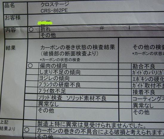 そういえばこの間のはなし・・・ PEライン対応のロッドがほしいかったのでコスト面で特に人気の高い メジャークラフト社のクロステージ CRS-862PEを購入しました http://www.naturum.co.jp/item/item.asp?item=547804&kotohaco=1 今メインとなっている9fのLATEO MLと比べみようなんて思って、買ってから3週間 程かるーくキャスティングテストメインの釣行を続けていたら・・・ ヴぁぎぃい ん?事故かな? Σ(゚Д゚;≡;゚д゚) 俺だ No.1の継目が割れているではないか~!!! ルアーもロッド基準内重量のものしか投げてないし!! 即刻、購入元の某釣具店に入院 ~ 3 週 間 後 ~ 新品になって返ってきました! (保証書も戻ってきました) ☆-ヽ(*´∀`)八(´∀`*)ノイエーイ 原因はカーボンの偏肉の傾向とのこと??? よくわかりませんが、バランスがとれてなかったのかな? こういった大量生産が行われる現場では抜取検査が主流 なので仕方無いのかな? 帰ってきたクロステージ君とまたシーバスが狙いにいけるんだから まぁ結果オーライってことで